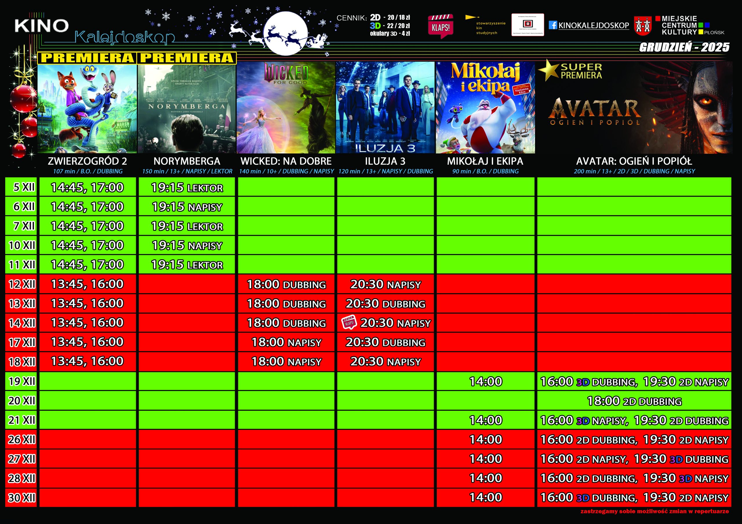 * bilet zbiorowy powyżej 20 osób, cena ustalana indywidualnie w zależności od dystrybutora filmu.