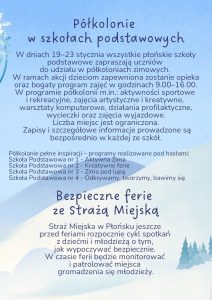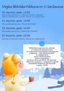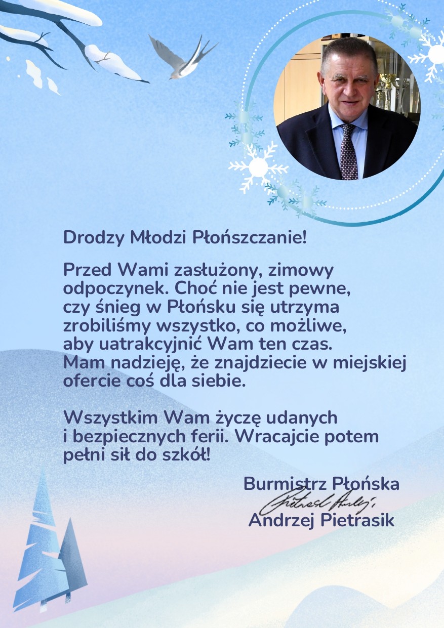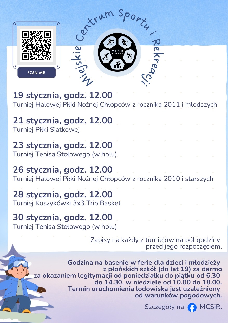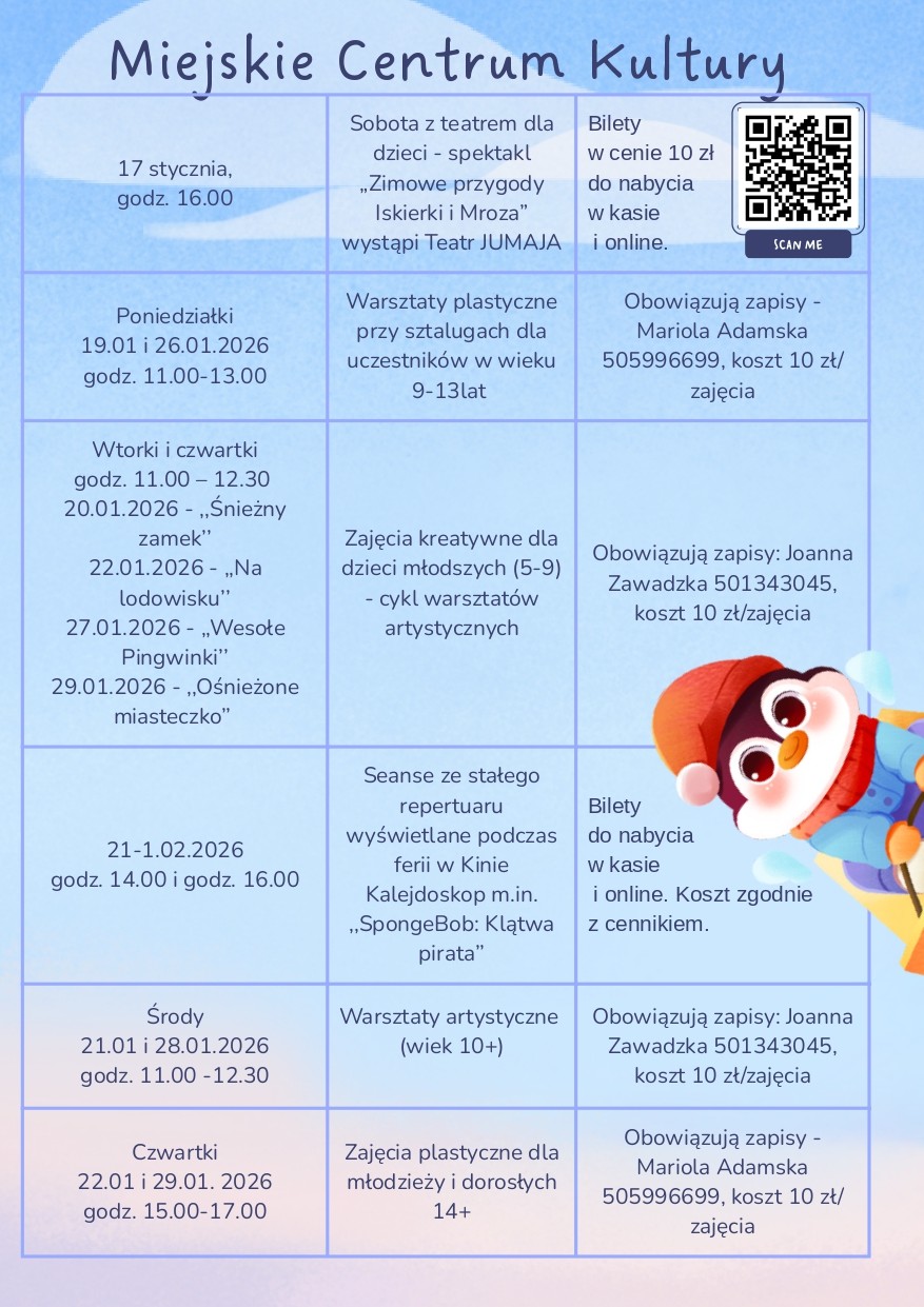 Od 19 stycznia 2026 roku rozpoczynają się ferie zimowe. To doskonały czas, aby spędzić je aktywnie i twórczo – także bez wyjazdu z miasta. Miejskie Centrum Kultury w Płońsku przygotowało bowiem wiele zajęć dla dzieci, młodzieży oraz dorosłych.