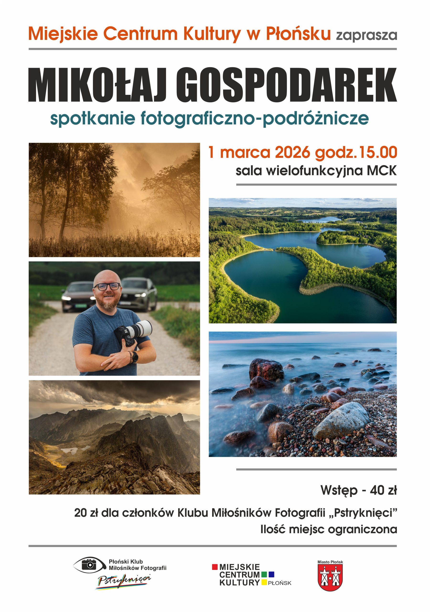 Miejskie Centrum Kultury w Płońsku zaprasza na wyjątkowe spotkanie fotograficzno-podróżnicze z Mikołajem Gospodarkiem, które odbędzie się 1 marca o godz. 15.00 w sali wielofunkcyjnej MCK. Wstęp – 40 zł, dla członków Klubu Miłośników Fotografii „Pstryknięci” – 20 zł. Liczba miejsc jest ograniczona.
