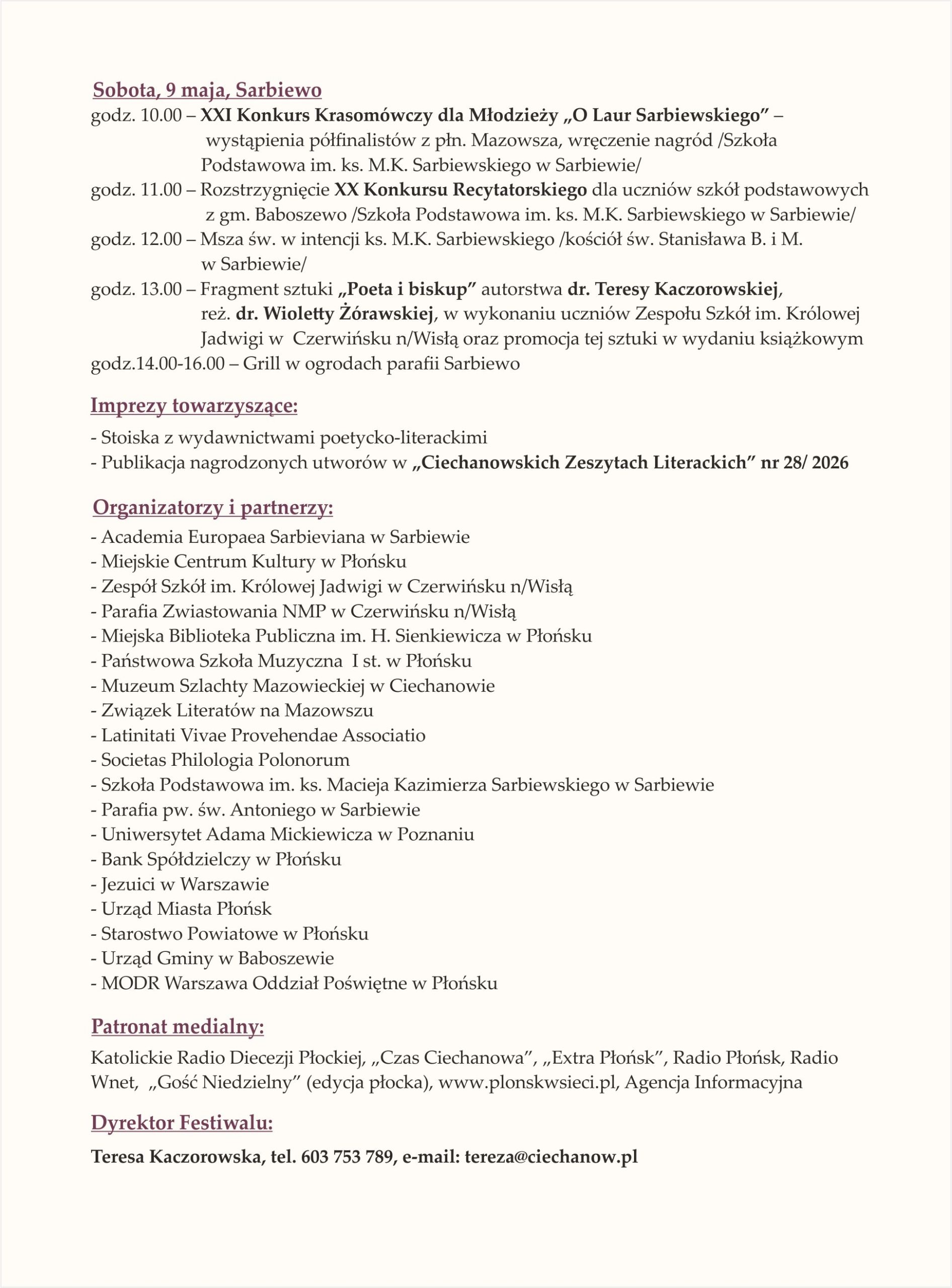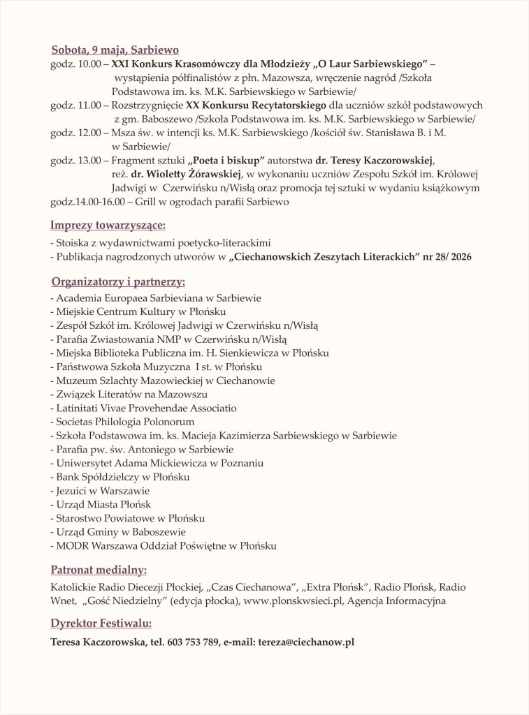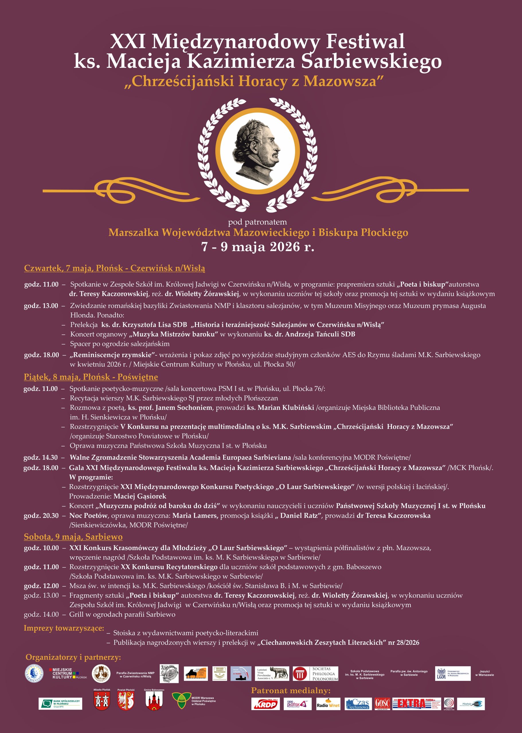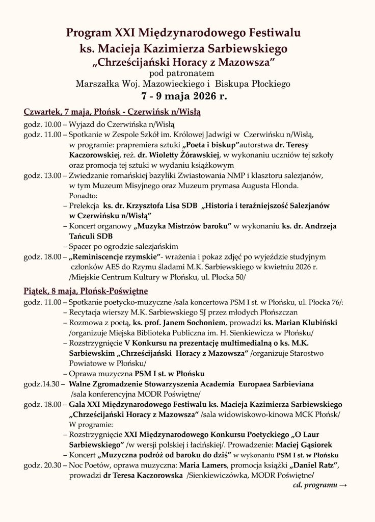Miejskie Centrum Kultury w Płońsku zaprasza na XXI Międzynarodowy Festiwal ks. Macieja K. Sarbiewskiego ,,Chrześcijański Horacy z Mazowsza’’, który w tym roku obchodzić będziemy w dn. 7- 9 maja 2026. Imprezie patronuje Marszałek Województwa Mazowieckiego i Biskup Diecezji Płockiej. W Festiwalu uczestniczyć będą pisarze i uczeni z Polski i zagranicy.